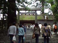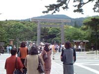 さて、JR伊勢市駅を降りて気がついたのですが、「伊勢神宮」には、天照大御神を祭る「内宮」と、 豊受大御神を祭る「外宮」の二つがあります。さて、どちらを先に行くかを迷いましたが、駅に程近い「外宮」は、 帰りに参拝するとして、先に、五十鈴川沿いの「内宮」へと赴くことにしました。 伊勢市駅前からは、市バスで移動したのですが、参拝者の多いこと多いこと・・・。 「内宮」へ続く道は、多数の自動車で渋滞状態となっており、いかなバスでも遅々として進まない状態でした。 それに業を煮やしてバスを下車。自分の足で進むことに・・・程なくして到着。 バスを降りて、わずか数百メートル先が「内宮」の入口となっていたのでした。 (それでも、バスよりも早く到着しましたけれどね♪)