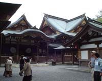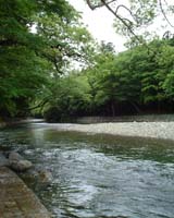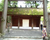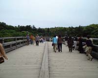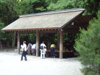 鳥居を潜ると、すぐ橋になっています。この橋は、五十鈴川を渡るためのもので、 この橋を渡ると、そこはもう、「伊勢神宮・内宮」の敷地です。 なお、この五十鈴川には、河原沿いに降りることも出来ます。実際に降りてみて、 びっくりしたのが、その清らかな透明度!まさしく、「清流」と称えてしまいたくなるほどの、 透き通った水が流れているのです。さらに、びっくりしたのが、この河原沿いに鯉が棲んでいるいることです。 池や沼ならいざ知らず、川を泳ぐ鯉は、それこそ、生まれて初めてお目にかかりましたよ、私ぁ・・・(^^; ![]() 川から上がり、再び参拝路を進むと、いよいよ、神宮としての建物が見えてきました。 「御手洗」、「神楽殿」、そして、順路の先には、いよいよ、天照大御神を祭る「正殿」が見えてきました。 残念ながら、正殿を写真に収めることは、(神社仏閣では当然ですが)「撮影禁止」のため断念しました。 正殿は「かやぶき」の屋根になっており、 それこそ、「大和民族」の主神を祭るにふさわしい作りとなっていました。これぞ、古来より伝わる「日本の神殿」 と言った風情の建築でしたよ。