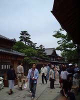ところで、「内宮」には、この「正殿」の他に数柱の神様を祭ってあるのですが、 その一つ、「天照大御神・荒御霊」を祭る「荒祭宮」へと赴きました。森林の合間にぽっかりと 佇む神殿でしたが、こちらでも、しっかりとお参りしてきました。 ・・・しかし、正殿の時よりも、より多くのお賽銭を入れた私って、いったい何・・・?(笑) ![]() そんなこんなで、時計を見ると、12時を回っていましたので、そろそろ「内宮」を後にすることにしました。 ![]() 伊勢「内宮」を後にして「外宮」を目指すわけですが、その参路沿いには、実に様々な「見どころ」があります。 そのひとつが、思わず「懐かしさ」を感じさせてくれる「おかげ横丁」です。 昔懐かしい駄菓子やおもちゃ、茶屋に乾物屋に洋食屋。じつに色々なお店が軒を連ねているのですが、 そのどれもが、思わず「ここは、江戸時代か?」と思わせるような佇まいをしているのです。(「洋食屋」さんのみ例外) この横丁には、かの有名な和菓子「赤福」を扱うお菓子処「赤福」の本店があります。今回はこの「赤福」へ一服しに、 行ってきました。「赤福×3ヶ(お茶付き)」で230円は、観光地のお店としては、かなり良心的だと思いますが、 やっぱり、茶屋で食べる和菓子は、最高ですね(^^ さて、「おかげ横丁」から、バスで戻ること20分。(実は、途中で「猿田彦神社」という所にも寄りましたが) ようやく、伊勢神宮「外宮」へ到着しました。外側からの外見は、「内宮」とほとんど同じで、「なるほど、どちらも 『伊勢神宮』か」と、納得してしまいました(笑) 調べたところによると、今から1500年前に、建立された神社であり、ここで祭られている神「豊受大御神」は、 食物を司る神様です。そう言えば、「古事記」にも、食物を司る神様が描かれていたと思いますので、 おそらく、その神様なのでしょう。