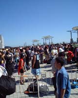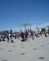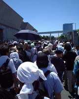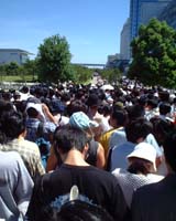 今回は、Cerisier氏が初のサークル参加と言うことで、午後にサークルスペースで待ち合わせ、 その後「たんぽぽ屋(成瀬ちさとさんのサークル)」へご挨拶と言う行程で時間を配分してました。 今回のお土産・・・、名古屋銘菓「ゆかり」!「ういろう」は、あの会場ではキツイ気がしたので、お煎餅にしてみました。 ![]() それで、まぁ、今回も例によって並んだわけですが(10時ごろ着は、確実に並びます)、今回は、割とスムーズに入場できた気がします。 夏ですから熱いのは当たり前なのですが(正午頃の有明の気温:37.8℃・・・)、 そんな中、一般参加の行列を整然と誘導してくれたスタッフの皆さんには感謝感謝です。 しかし・・・、スタッフの一人に「こみパ」スタッフが紛れていたような気が・・・?(^^; 話戻って、結局11時入場だったのですが、あまりのスムーズさに、「今回、参加者減ったのか?」とも思ってしまいましたが、それは杞憂・・・ を通り越して、思い違いであることを、この後、ガレリア内で知ることになります・・・(^^;;; ![]() さて、上の写真の行列は、どこのサークルさんでしょう? Salix的、今回最大の失敗は、このサークルさんが参加していることに、行列を見るまで気がつかなかったことでしょう(^^; なんと言っても、私、この人の絵、メッチャ好きですからねぇ・・・。それを、その場で見るまで気がつかなかったとは・・・、 Salix一生の不覚!です。 まぁ、一縷の望みを賭けて(とは言っても、Cerisierさん等との待ち合わせまで1時間を切っていましたが)最後尾に並びましたが、 如何せん、列が全然前に進んでいかないのですよねぇ。 <誘導のスタッフの人の声> 「今から並ばれても(品物を)手に入れられる可能性は、ほとんどありません・・・ と、1時間前から言っていますが、列は伸びていく一方です!」(^^; 結局、時間ぎりぎりまでねばってはみたのですが、結局、諦めて移動することにしました。 (ちなみに、この時点で、時刻は12時50分だったのですが、後日確認したところ、 14時30分位までは、新刊をゲットできたらしいです。や〜ら〜れ〜た〜〜〜!!) ところで、この時、気がついたのは、「超」が付く大手サークルの配置についてです。 現場でコミケスタッフの口から出た「配置失敗したー!」と言う台詞が表しているように、 今回のこのサークルさんの配置は、行列の(最長の)長さから考えると、絶対に間違っていたと思いますよ。 なんと言っても、列が折り返してましたしねぇ・・・。 次回は、もっと頑張れ、コミケスタッフの皆さん!! ![]() 午後2時になり、合流していたCerisierさん(と、我が相方)と「たんぽぽ屋」さんへ。 休憩から戻られた成瀬さんに押しかけ(おい)、少しお話しつつ(相方と漫才やっていたと言う説もあり)、 差し入れ(「お土産」と言ったほうが妥当かも・・・)を手渡し、早々に撤収してきました。 (今年も、押しかけてしまってすみませんでした。来年も押しかけますので、よろしくお願いします(おいおい)) さて、Cerisierさんとも別れ、飛行機の時間も押してきていた(実は、このまま羽田から実家へ直行だったのですよ、このあと)ので、 ビックサイトを後にしようと帰り道。「せっかくだから、コスプレスペースでも行ってみるか」と言うことで、西館方面へ。 実は、朝の入場の際に、列の流れとご挨拶周りの順番(最初の知り合いのサークルが、西館だったのです)の都合上、一度、 コスプレスペースに寄って来ていたのです(その時の写真が上記左のです)が、改めてきてみると、「なんじゃこりゃ〜〜〜!」な人の数(上記右) カメラ小僧の皆さん、よく、あんな状況で写真など撮れますねぇ・・・。と、妙な感心をしつつ、転進して撤収してきました(^^; 結局、15時ごろ、比較的スムーズに「国際展示場駅(臨海副都心線)」までたどり着け、ビックサイトを後にしました。 今回、一番びっくりしたのが、外国の方が一般参加やっていたり(例の行列にもいましたよ)、韓国の方が同人誌だしていたりしたことです。 コミックマーケットも「国際化」してきたのだなぁと、感慨深く思います。やるな、ジャパニメーション!(^^; こんな感じで、次回冬の陣!一体、何が起こるか!? 期待せずに待て!!(爆 ![]() |